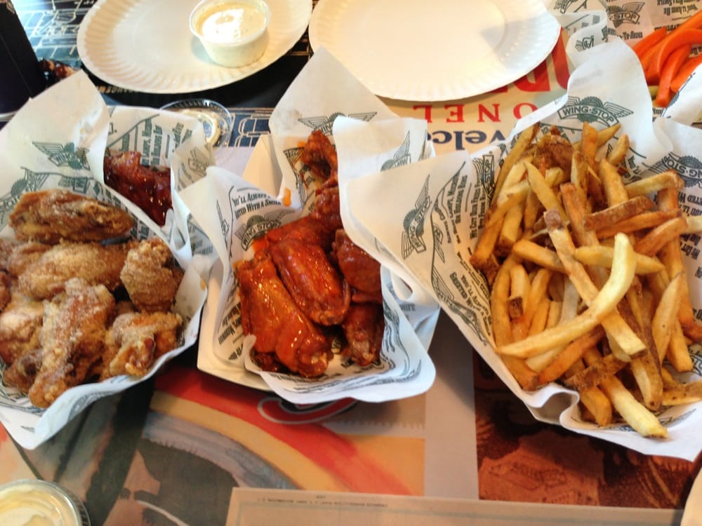 75 Boneless or Classic (Bone-In) wings with up to 5 flavors, 3 large fries, 3 veggie sticks and 6 dips. (Feeds 9-13)